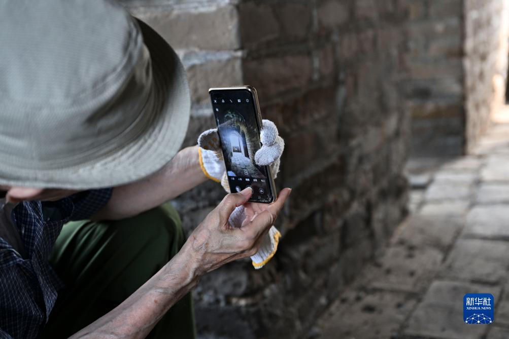 在北京延庆的长城花家窑子段一座敌楼内,严欣强用手机拍摄楼内的拱券结构(9月5日摄)。