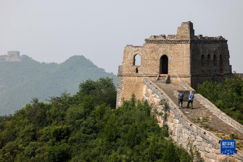 严欣强(右)和严共明在考察北京延庆的长城花家窑子段(9月5日摄)。