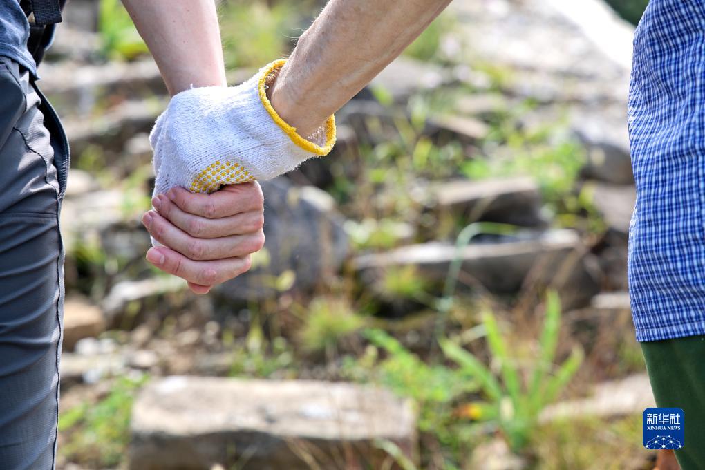 严共明(左)拉着严欣强行走在北京延庆的长城花家窑子段(9月5日摄)。