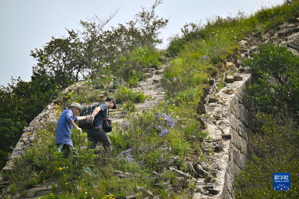 严共明(右)拉着严欣强行走在北京延庆的长城花家窑子段(9月5日摄)。