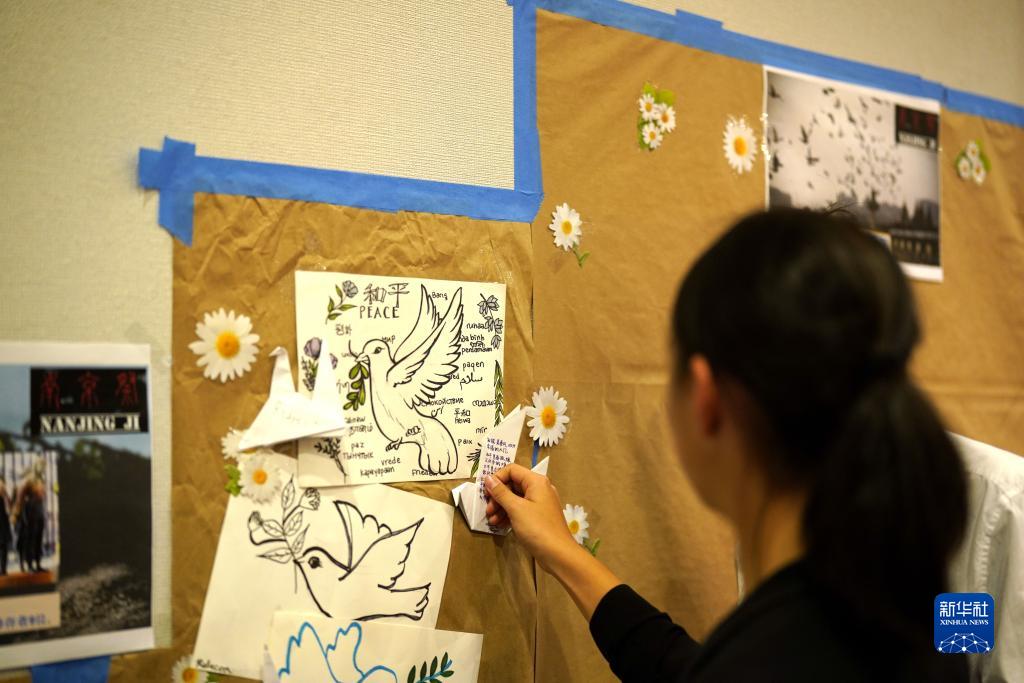 12月10日,一名参与者在美国旧金山举行的“南京祭”活动上张贴以和平鸽为主题的祈愿寄语。