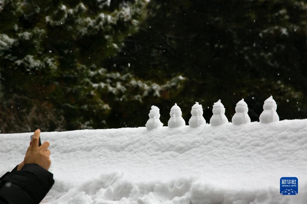12月13日,游客在北京中山公园拍摄自己做的小雪人。