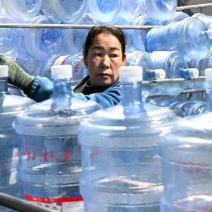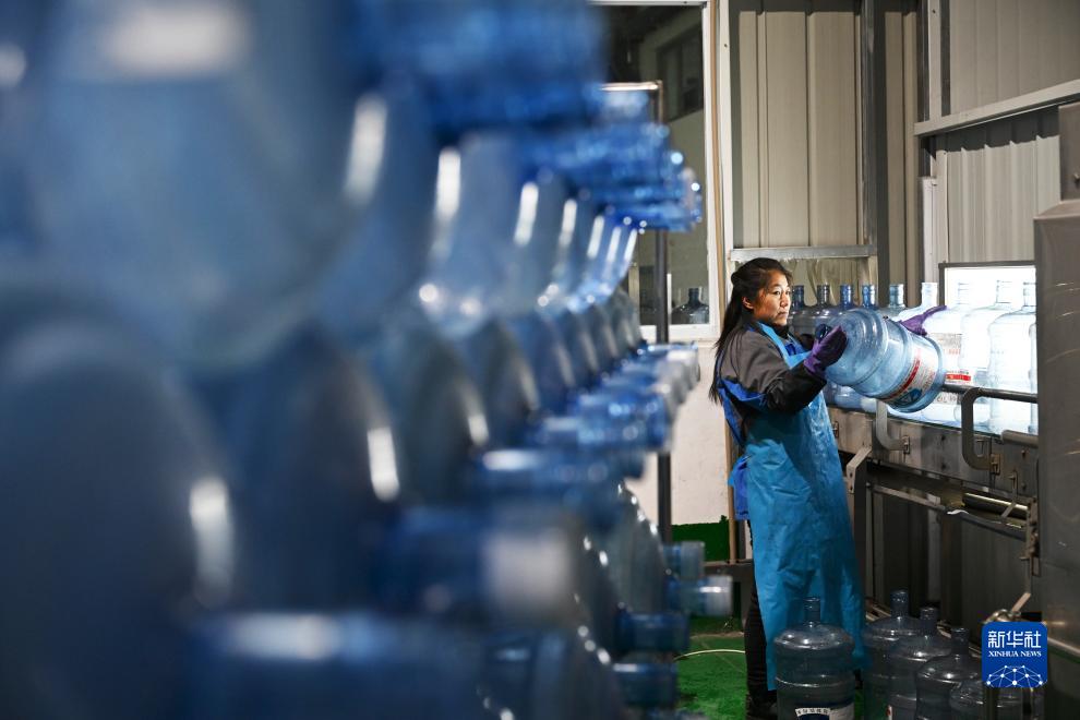 12月13日,隆化县蓝旗镇一家矿泉水厂工作人员在检查矿泉水桶。