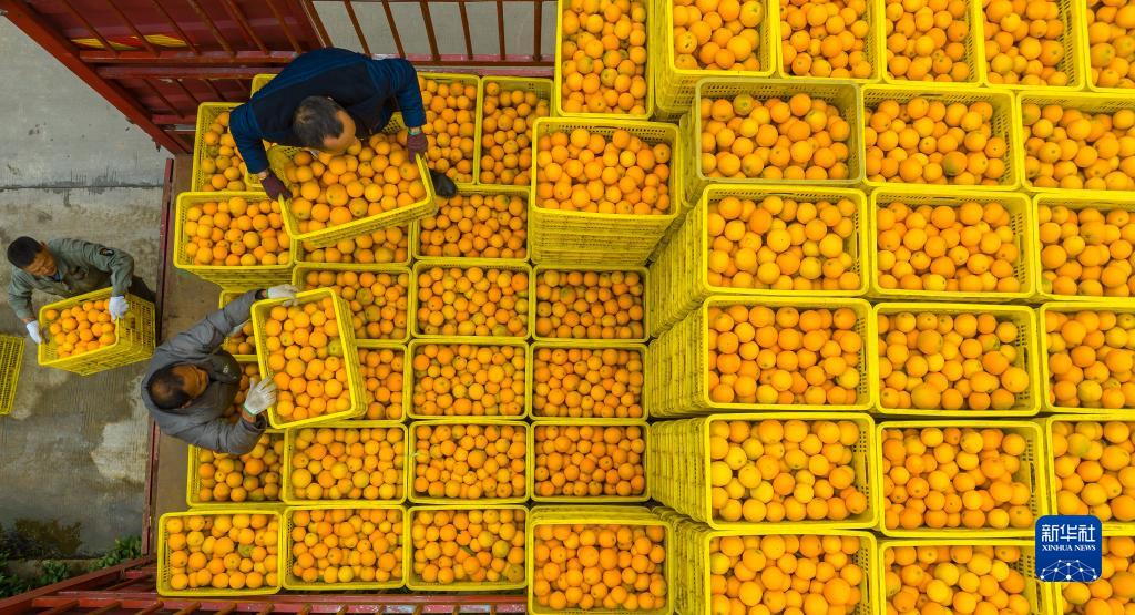 三峡库区湖北省宜昌市秭归县的冬季脐橙进入收获季,当地果农抓紧采摘、转运、包装,供应市场,助农增收。