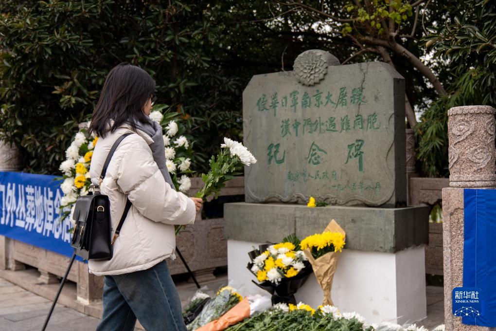 12月13日,在江苏南京,市民在侵华日军南京大屠杀汉中门外遇难同胞纪念碑前向遇难同胞献花。