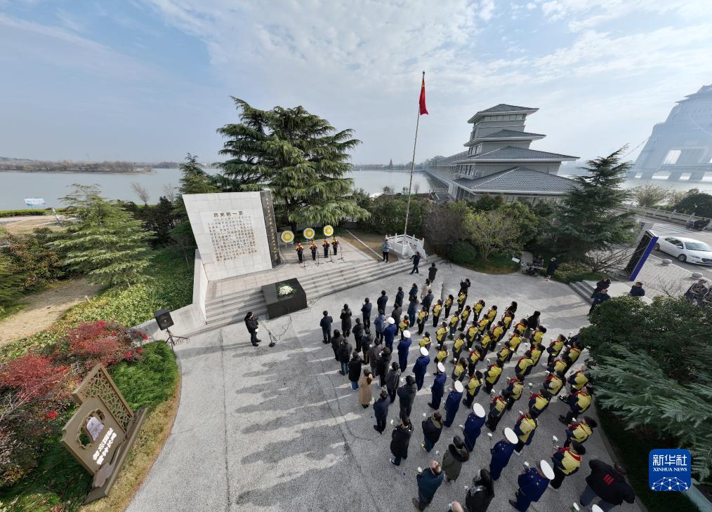 12月13日,在江苏扬州,各界群众在侵华日军万福桥大屠杀遇难同胞纪念碑前举行悼念活动(无人机照片)。