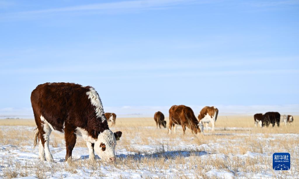 12月13日,牛群在锡林郭勒草原上觅食。