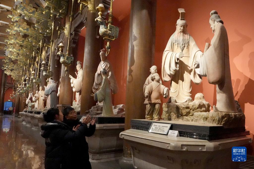 游客在曲阜“尼山圣境”参观七十二贤廊里的雕塑(12月13日摄)。