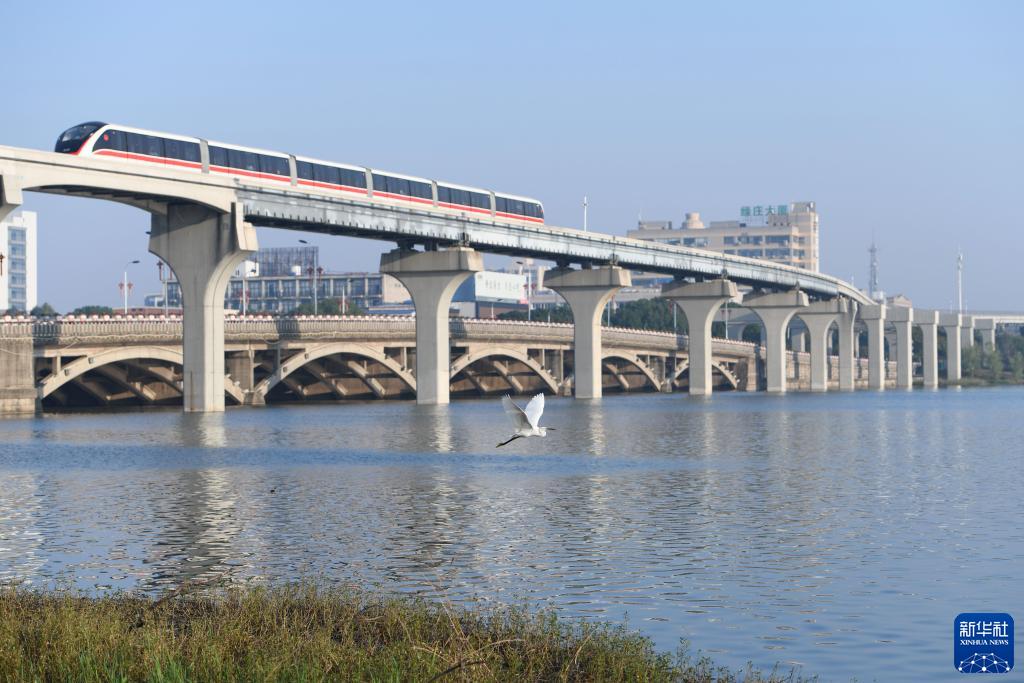 10月18日,一辆单轨列车行驶在安徽芜湖市银湖上方。