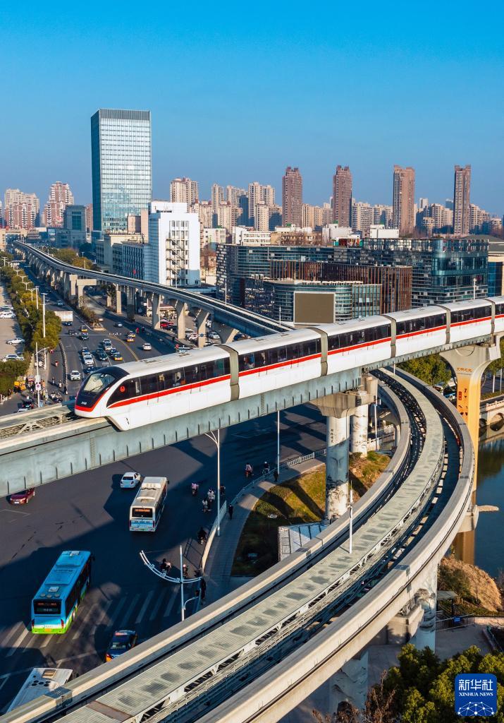 一辆单轨列车行驶在安徽芜湖市镜湖上方(2023年1月11日摄,无人机照片)。