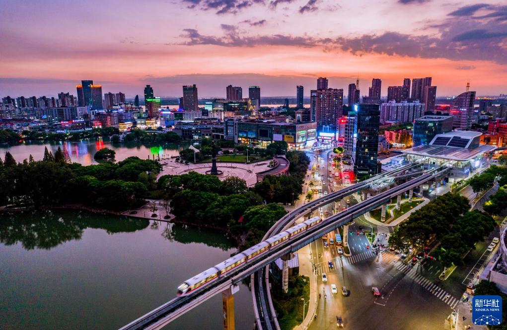 这是单轨列车行驶在安徽芜湖市区的景象(2022年9月16日摄)。