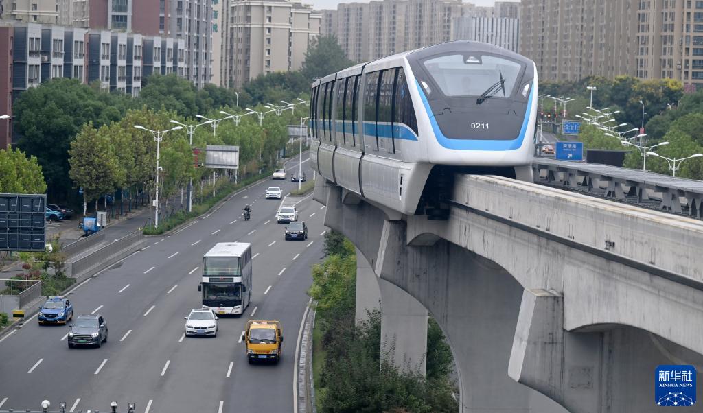 9月14日,一辆单轨列车行驶在安徽芜湖市区。