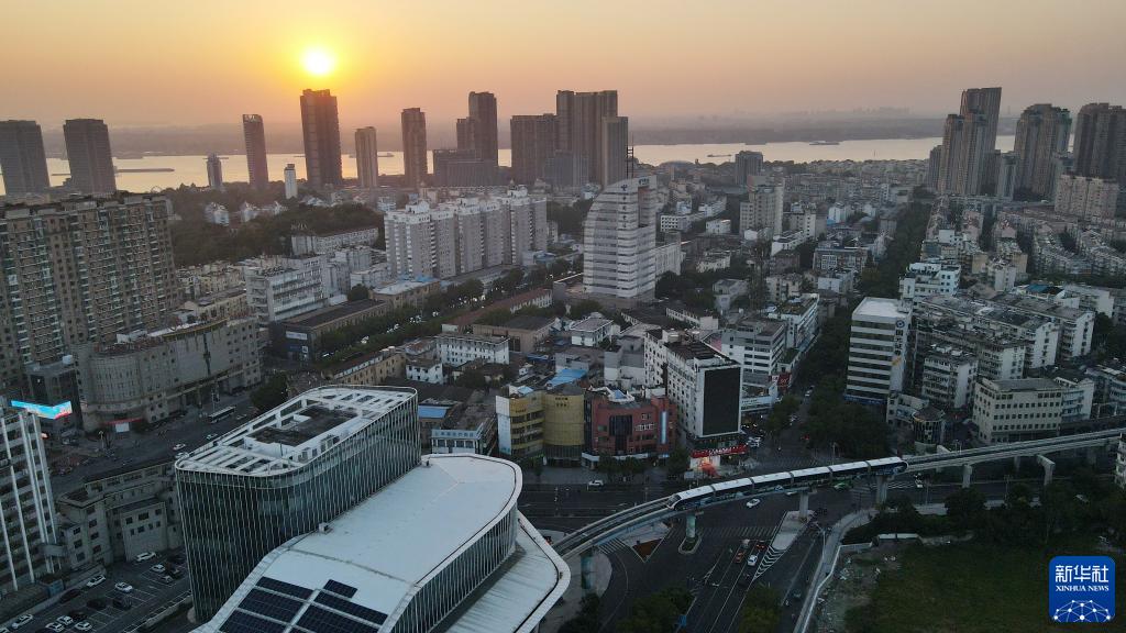 10月17日,一辆单轨列车行驶在安徽芜湖市区(无人机照片)。