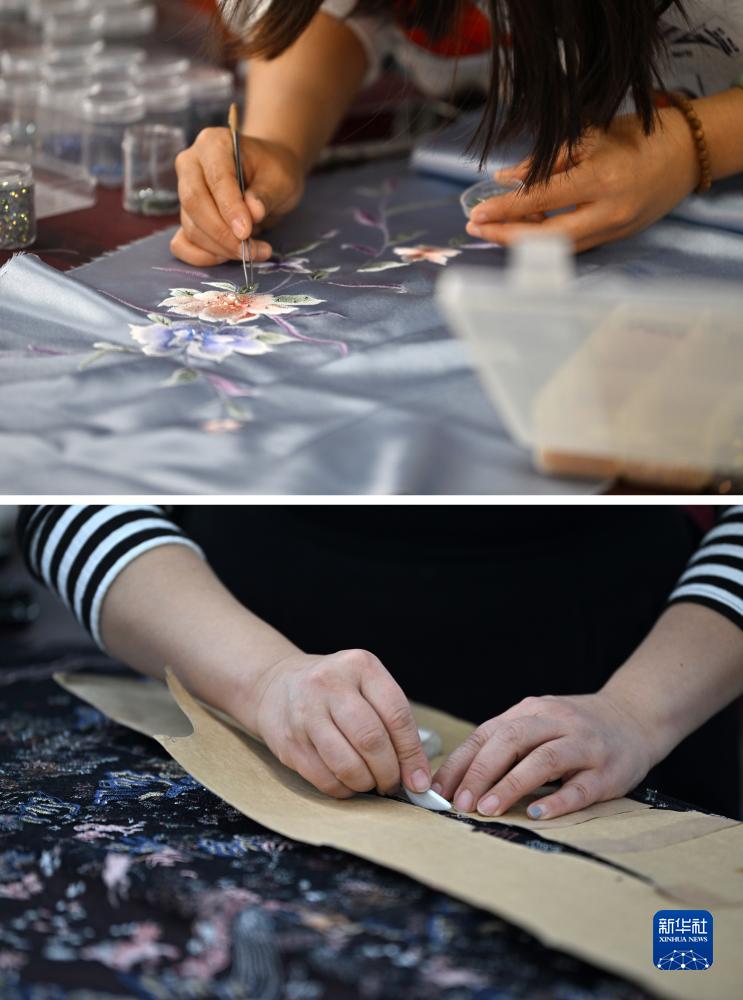 拼版照片:上图为老美华定制车间的制衣师傅在面料上贴钻;下图为老美华定制车间的制衣师傅在面料上划线(12月8日摄)。