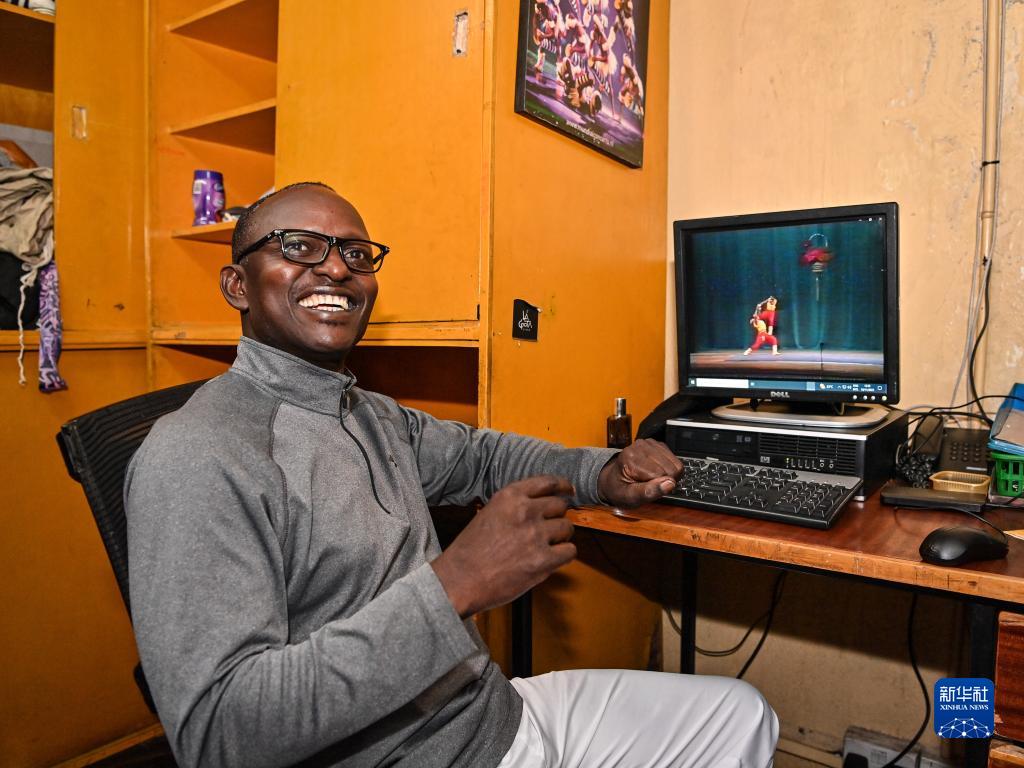 11月18日,在位于肯尼亚首都内罗毕的内罗毕杂技艺术剧院内,马蒂亚斯在办公室内展示自己1985年在中国表演杂技的录像。