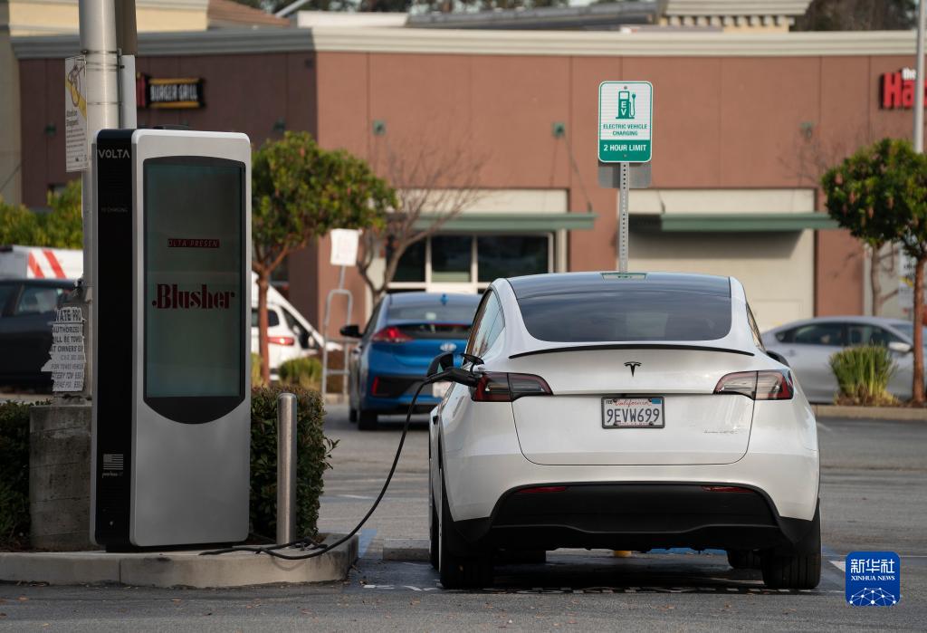 12月13日,一辆特斯拉电动车在美国加利福尼亚州圣马特奥县一处停车场充电。