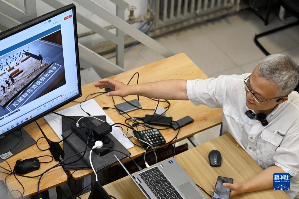 李哲在工作室内介绍长城烽传系统特效模型(7月25日摄)。