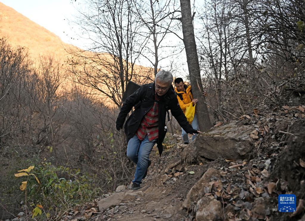 李哲(前)和学生徒步前往北京箭扣长城(11月3日摄)。