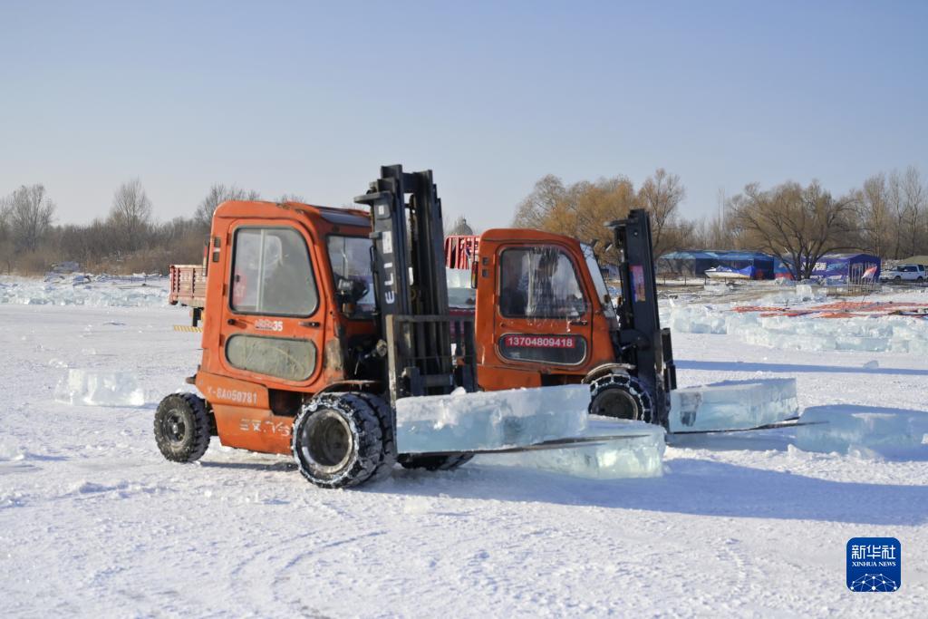 眼下,第二十五届哈尔滨冰雪大世界采冰工作已全面展开。在封冻的松花江哈尔滨段江面,采冰工人肩扛手拉,从封冻的松花江里采出一块块晶莹剔透的冰块,运冰车、叉车、铲车在江畔往来穿梭,呈现一派热火朝天的繁忙景象。