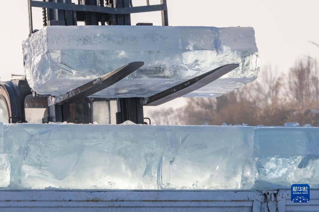 眼下,第二十五届哈尔滨冰雪大世界采冰工作已全面展开。在封冻的松花江哈尔滨段江面,采冰工人肩扛手拉,从封冻的松花江里采出一块块晶莹剔透的冰块,运冰车、叉车、铲车在江畔往来穿梭,呈现一派热火朝天的繁忙景象。