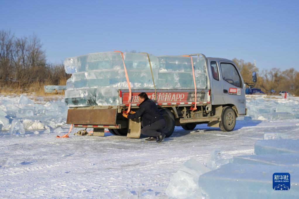12月14日,工人将成捆的冰块固定在运冰车上。
