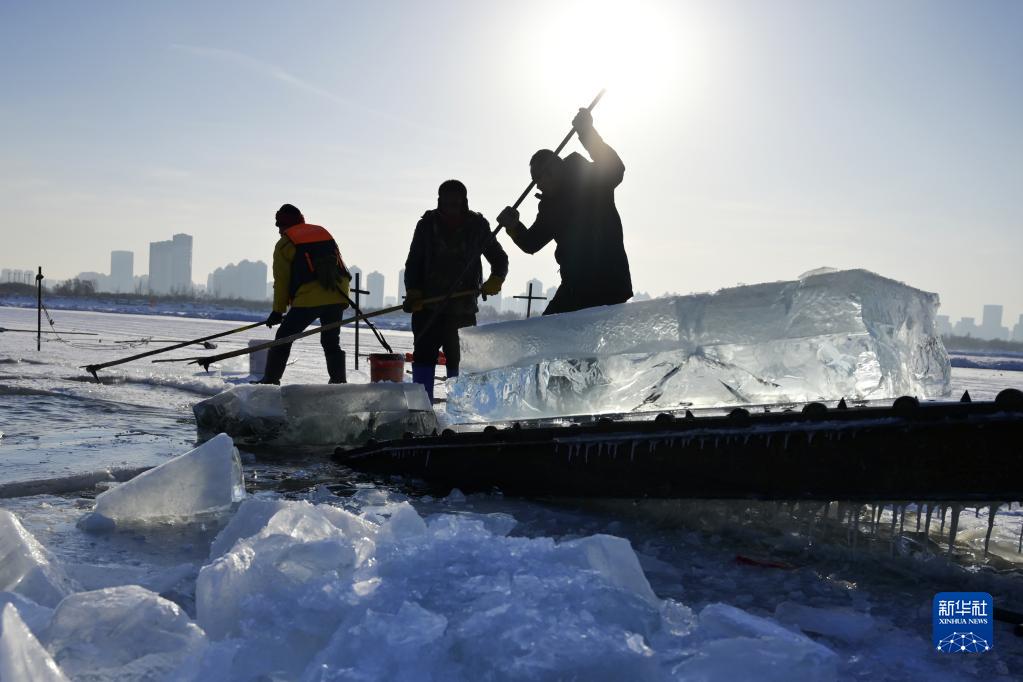 12月14日,工人在封冻的松花江哈尔滨段江面采冰。