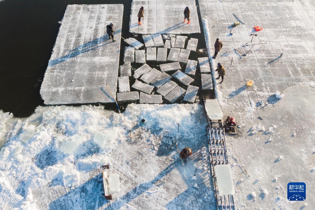 12月14日,在封冻的松花江哈尔滨段江面,采冰工人在进行采冰作业(无人机照片)。