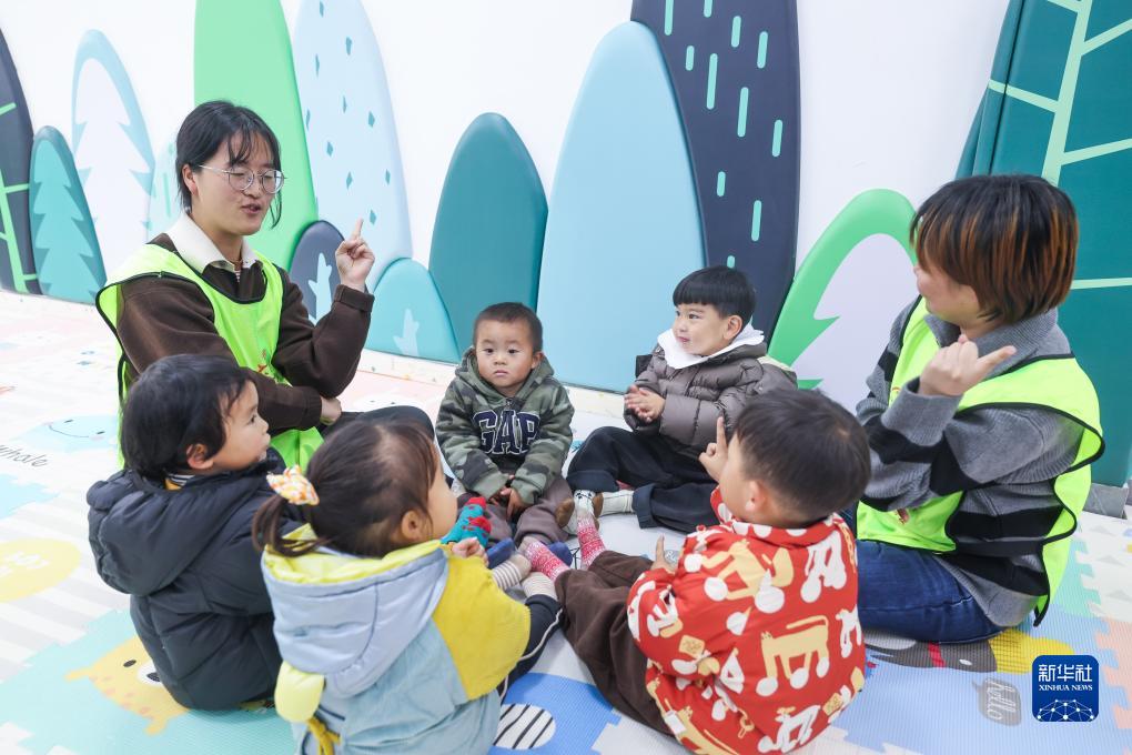 12月15日,在太阳镇邻里中心的婴幼儿成长驿站内,青年志愿者带着孩子在玩耍。