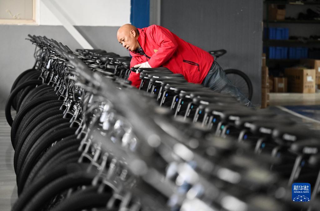 在飞鸽自行车的一处工厂内,工作人员在车间码放组装完成的电助力自行车(12月13日摄)。