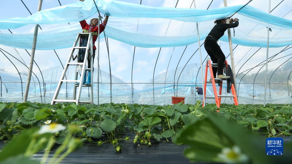 12月15日,在贵州省黔南布依族苗族自治州都匀市匀东镇大坪村草莓种植基地,农户加盖大棚保温膜,做好抵御寒潮的准备。
