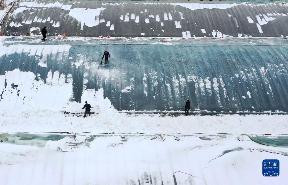 12月15日,山东省滨州市滨城区杨柳雪镇的农民在清理蔬菜大棚上的积雪(无人机照片)。