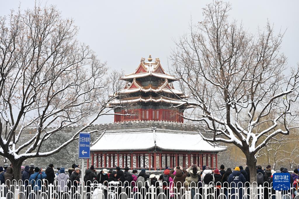 12月11日,人们在北京故宫角楼拍摄雪景。