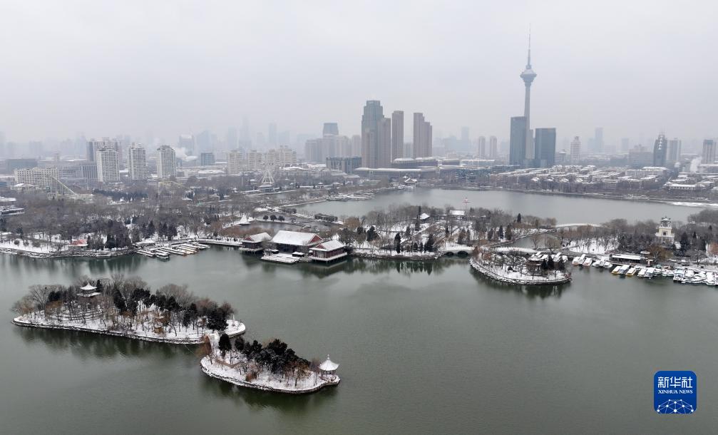 12月13日拍摄的天津水上公园雪景(无人机照片)。