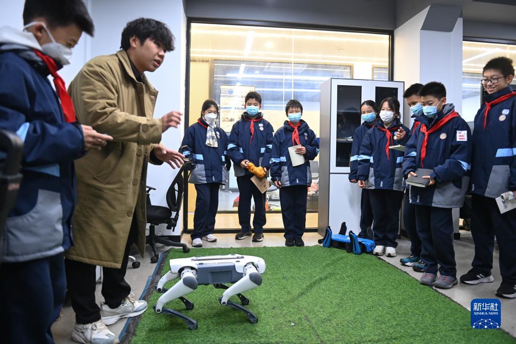 12月15日,杭州市第十五中学学生在石虎山机器人创新基地体验操控四足仿生机械狗。