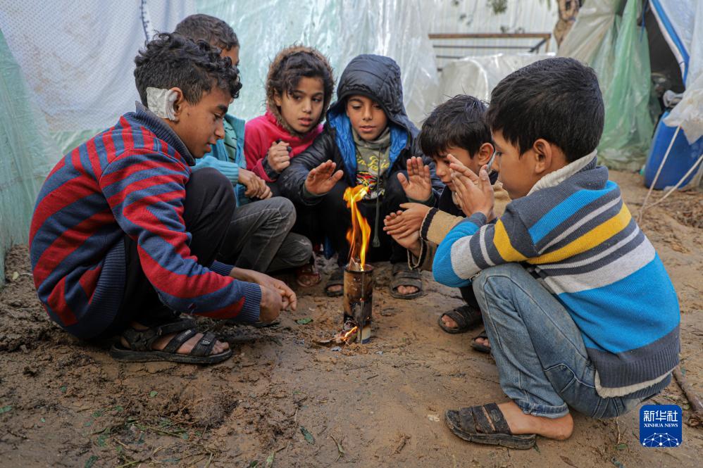 这是12月13日在加沙地带南部城市汗尤尼斯一处临时营地拍摄的巴勒斯坦儿童。
