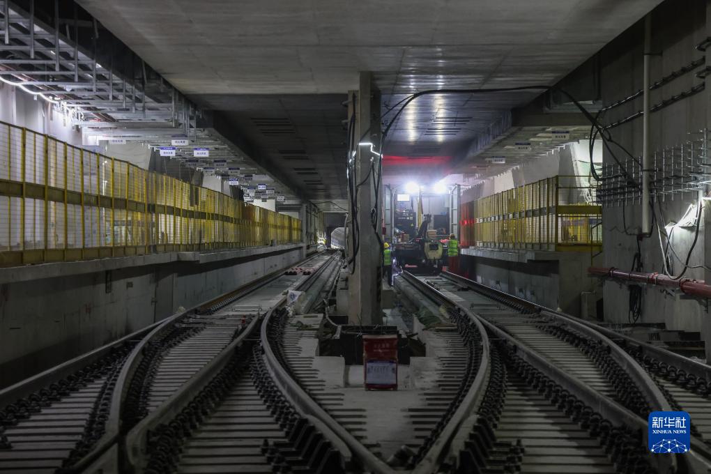 12月16日,施工人员在深圳地铁3号线四期工程终点站坪地六联站进行轨道铺设作业。