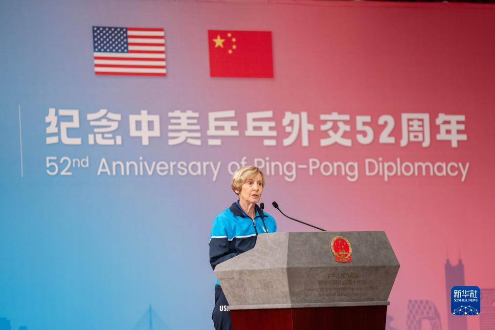 12月13日,在美国首都华盛顿,1971年首次访华球员康妮·史维利斯在中美“乒乓外交”52周年纪念活动上致辞。