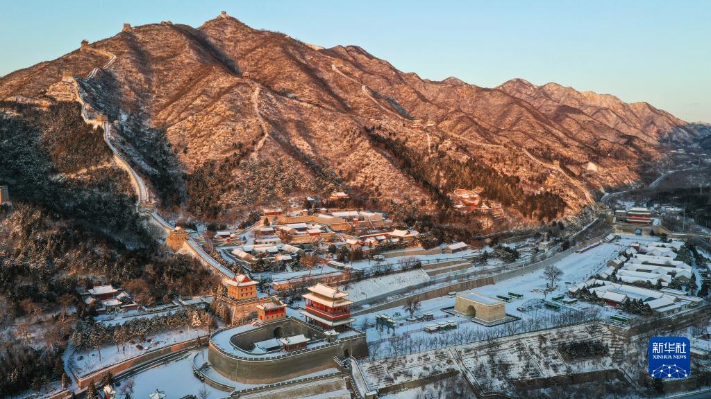 12月16日,朝阳洒在雪后的居庸关长城上(无人机照片)。