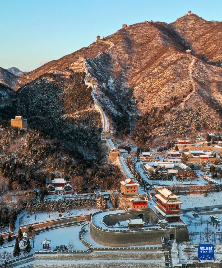 12月16日,朝阳洒在雪后的居庸关长城上(无人机照片)。