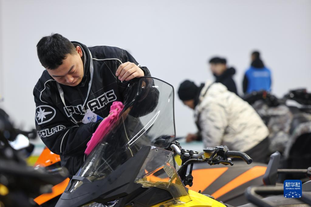 12月16日,参展人员在展销会上清洁雪地摩托。