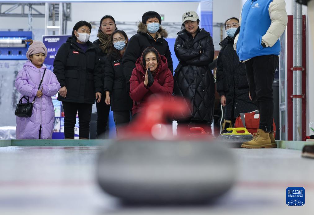 12月16日,市民在展销会上体验冰壶。