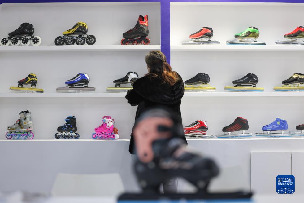 12月16日,参展人员在展销会上整理冰鞋。