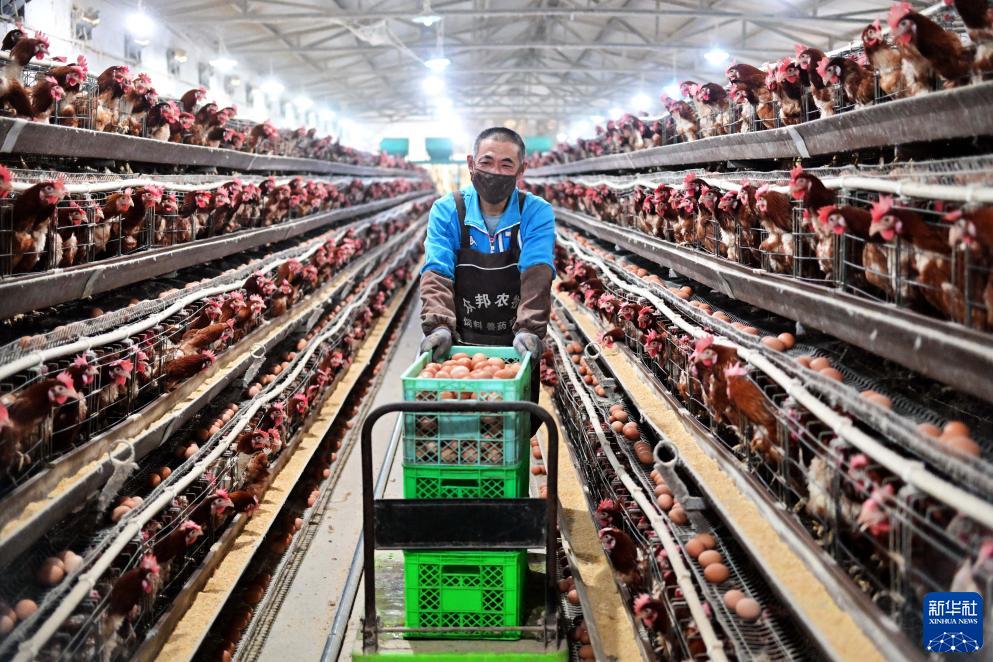 12月16日,河北省滦州市滦城街道办事处后明碑村一家蛋鸡养殖合作社的社员在将捡拾的鸡蛋运出鸡舍。