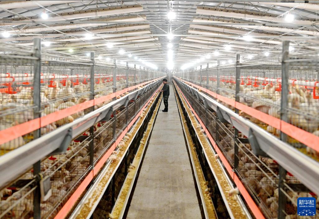 12月16日,河北省滦州市滦城街道办事处杨家院村一家肉鸡养殖合作社的社员在鸡舍内工作。