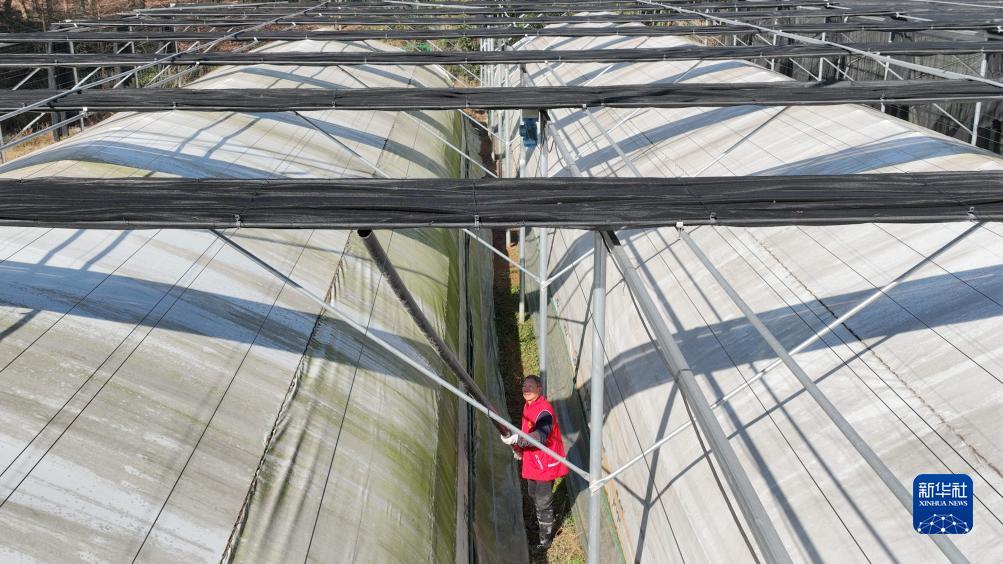 12月17日,志愿者在浙江省湖州市德清县阜溪街道民进村小叶子食用菌种植基地帮助种植户加固温室大棚(无人机照片)。