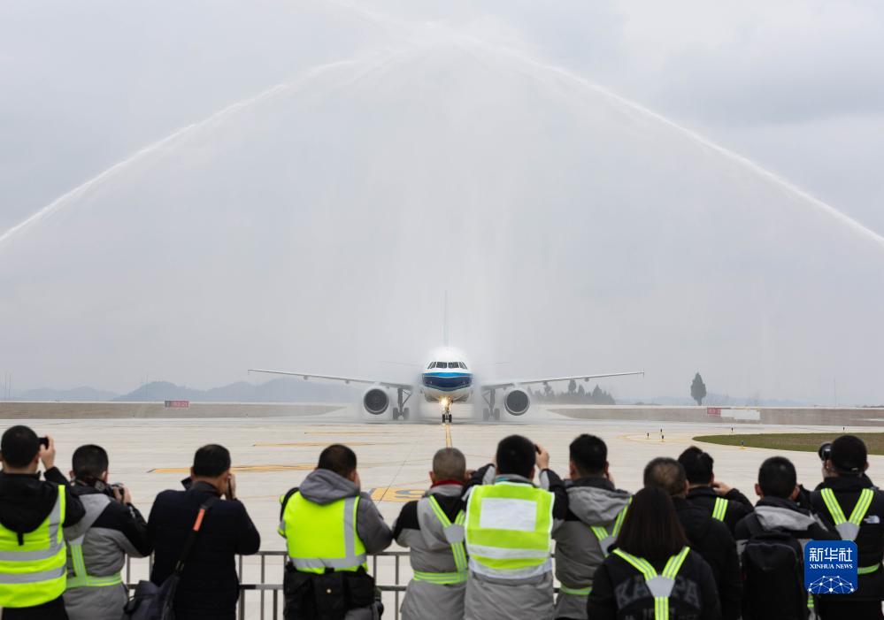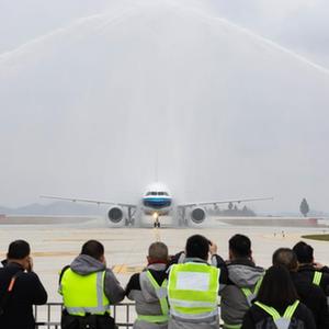 12月17日,中国南方航空CZ2281次航班抵达阆中古城机场,通过“水门”。