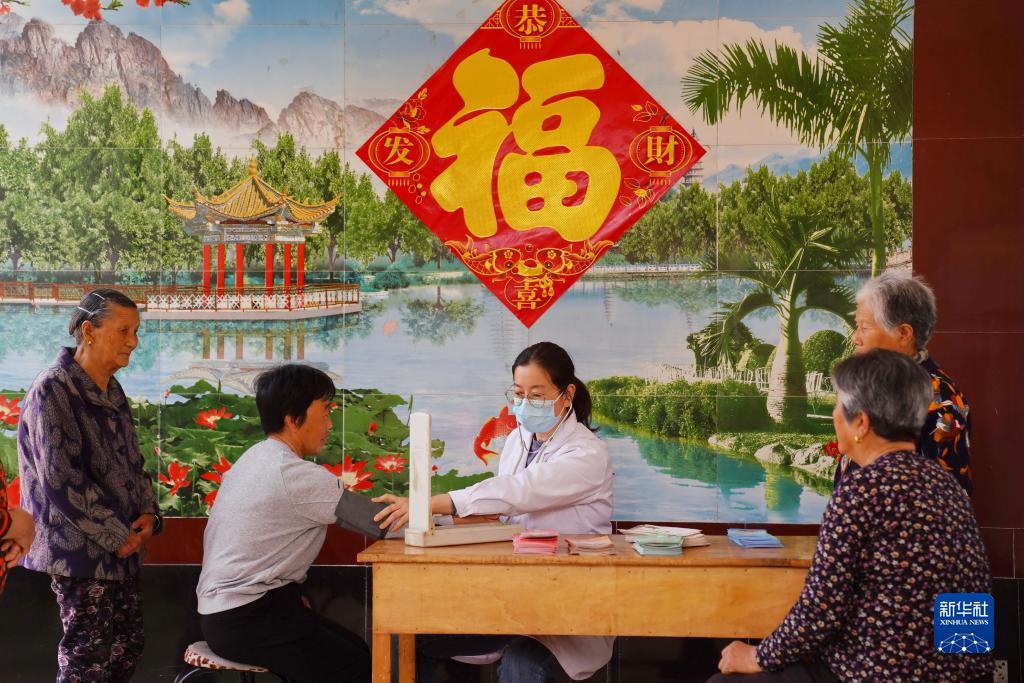 河北省平乡县寻召村村医在“幸福小院”内为老人们量血压(2023年4月20日摄)。近年来,河北省平乡县利用农村闲置院落,按照“就近集中、邻里互助、抱团养老”的模式,采取社会捐助、乡村筹集、县财政补助等形式,先后打造出300余个“幸福小院”。