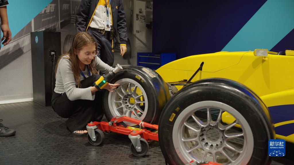 12月16日,参访团成员卡丽娜体验给赛车更换轮胎。