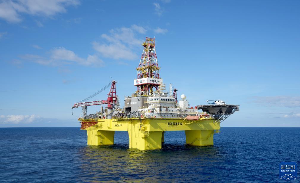 “海洋石油982”半潜式钻井平台是我国自主投资、于2014年至2018年建造的第六代深水半潜式钻井平台,型长104.5米、型宽70.5米、型高37.55米,最大钻井深度9144米,是全球最先进的第六代钻井平台之一。
