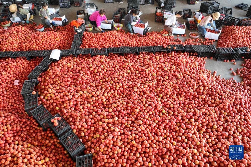 12月17日,云南省元谋县元谋蔬菜批发市场内,工人将西红柿装箱外运(无人机照片)。